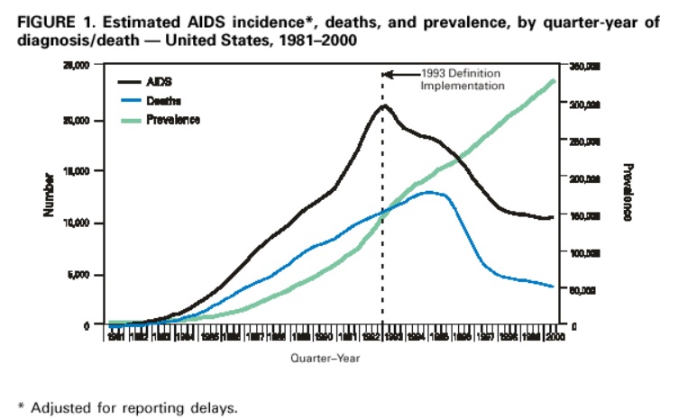 (This hard to read graph is from the CDC. It shows that AIDS deaths and prevalence peaked in the U.S. in the early 90s, and then began to wane by the mid 90s)