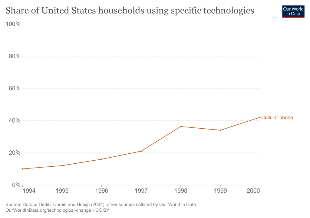 And yet despite its clunky beginnings, people were far more excited about the internet back then than they are now. As you can see from the graph above, few U.S. homes had the internet in the 90s. It was a luxury for the upper and middle class, as well as a novelty. Internet and computer usage didn’t start to become widespread in U.S. households until the late 90s/early 2000s. Until the late 90s, most homework was still handwritten and most research kids did for school was still done at the library. If someone needed directions somewhere, they would look at a map or get verbal directions. Even when I first learned how to drive in 2004, people were still primarily using maps and verbal directions.