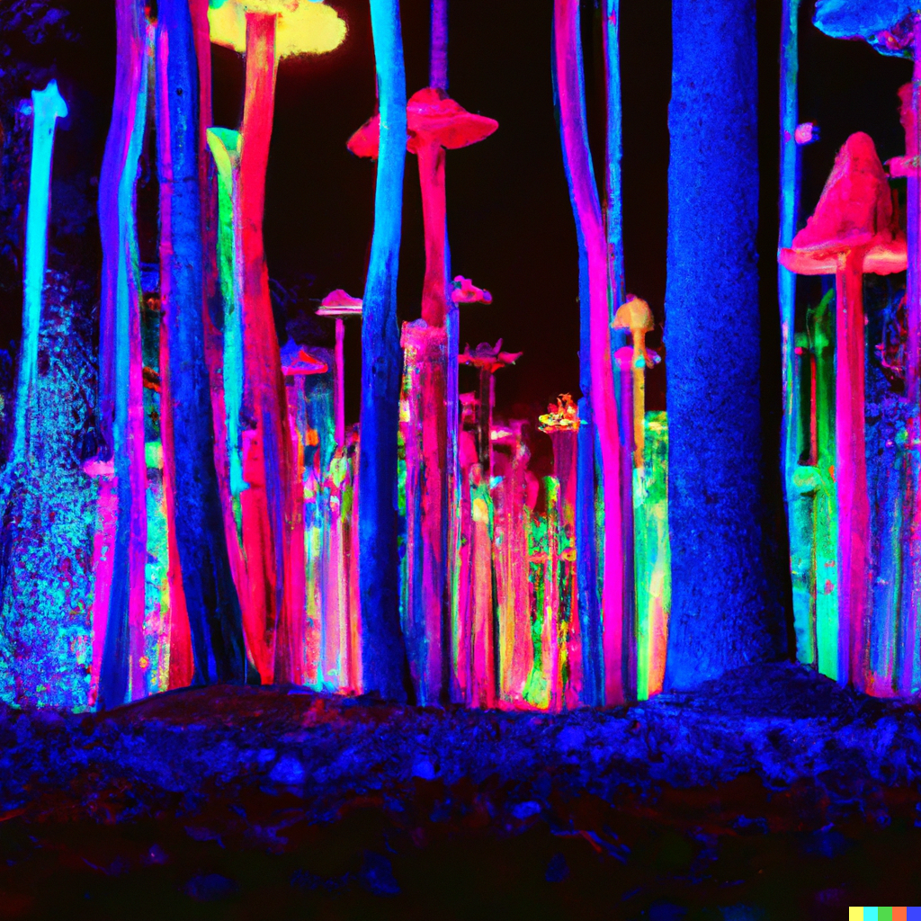 (Picture of “tall colorful mushrooms at night” generated with DALLE-2)